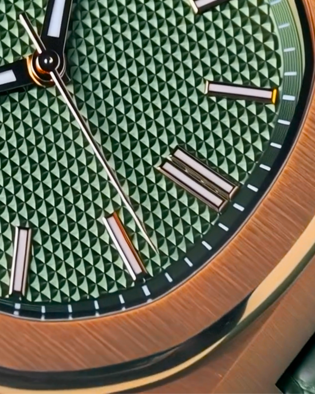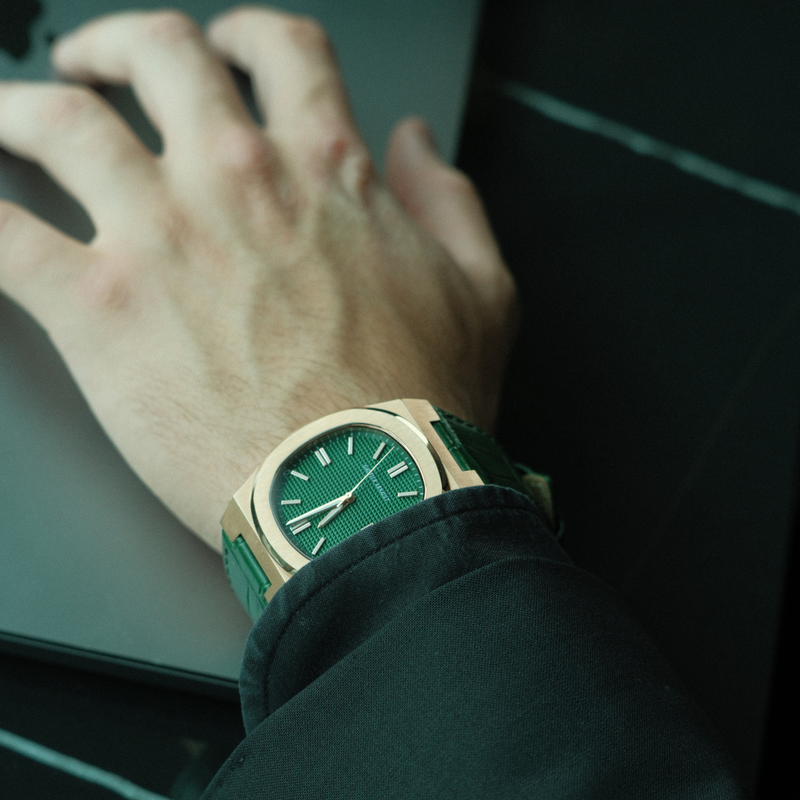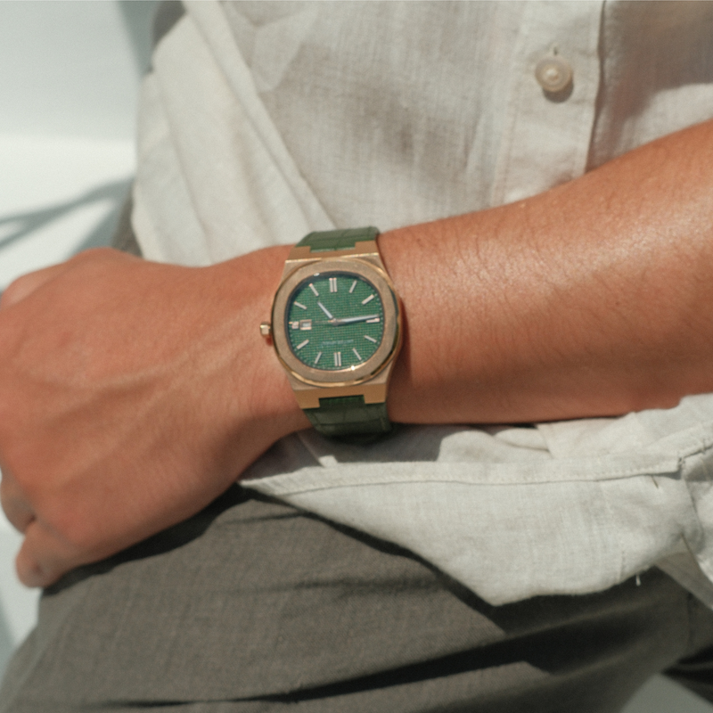 The rose-gold case carries warmth, giving the watch a tactile sense of closeness, while the emerald dial and matching crocodile-pattern leather strap introduce a color foundation that feels alive. Emerald has long been associated with renewal, intuition, and depth of character — qualities that shape the watch's emotional presence as much as its appearance. On the wrist, Embroidet reads as composed rather than loud; confident without reaching for attention. It draws the eye not through excess, but through harmony of tone and material.