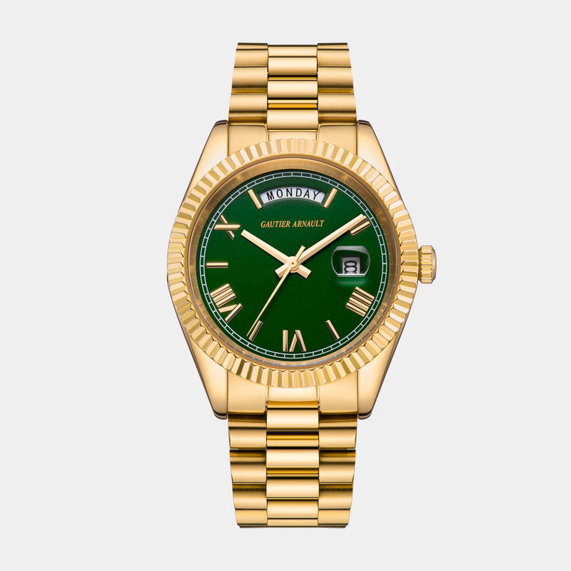 Elegance is not neutral; it is alive with intent. The deliberate balance of the rose-gold case and the rich emerald strap creates a synergy of materials that is undeniable. This timepiece is designed for those who know that true sophistication lies in tradition and harmony. Beneath the scratch-resistant Sapphire Crystal, the Japanese GM12 Movement offers precise, unbroken timekeeping—a quiet affirmation of reliability.