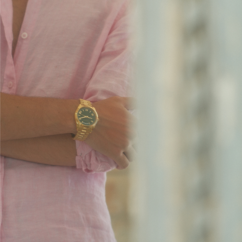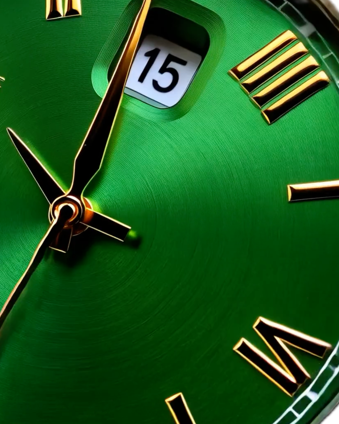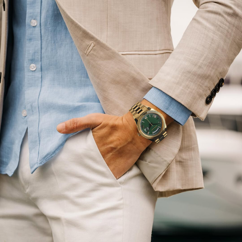 The Takeover represents unapologetic presence. Its polished gold case radiates power, while the emerald-green dial strikes a sharp balance of strength and sophistication. Luminous Roman numerals and a day-date window bring clarity to every glance. Slim in profile but maximal in impression, The Takeover carries authority that cannot be ignored.