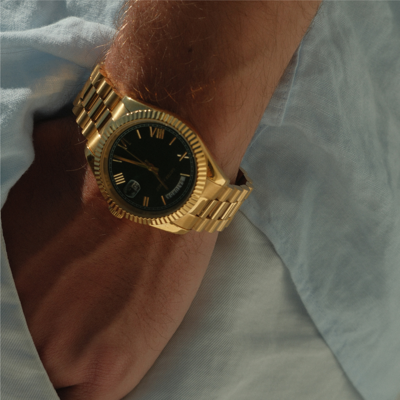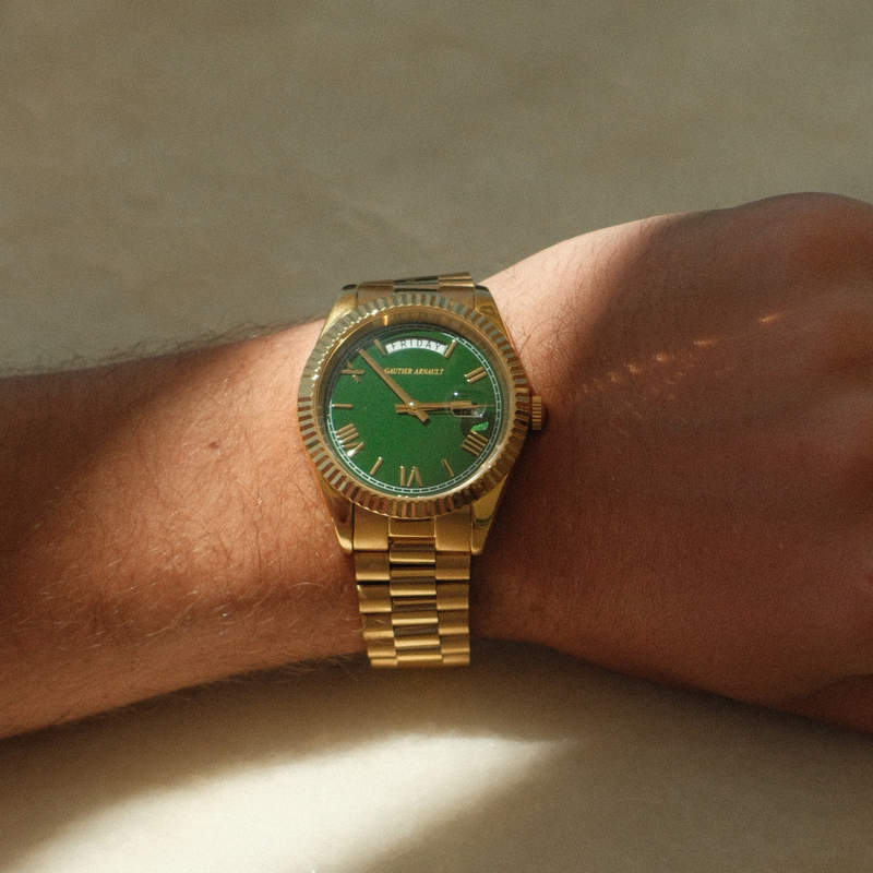 The Takeover represents unapologetic presence. Its polished gold case radiates power, while the emerald-green dial strikes a sharp balance of strength and sophistication. Luminous Roman numerals and a day-date window bring clarity to every glance. Slim in profile but maximal in impression, The Takeover carries authority that cannot be ignored.